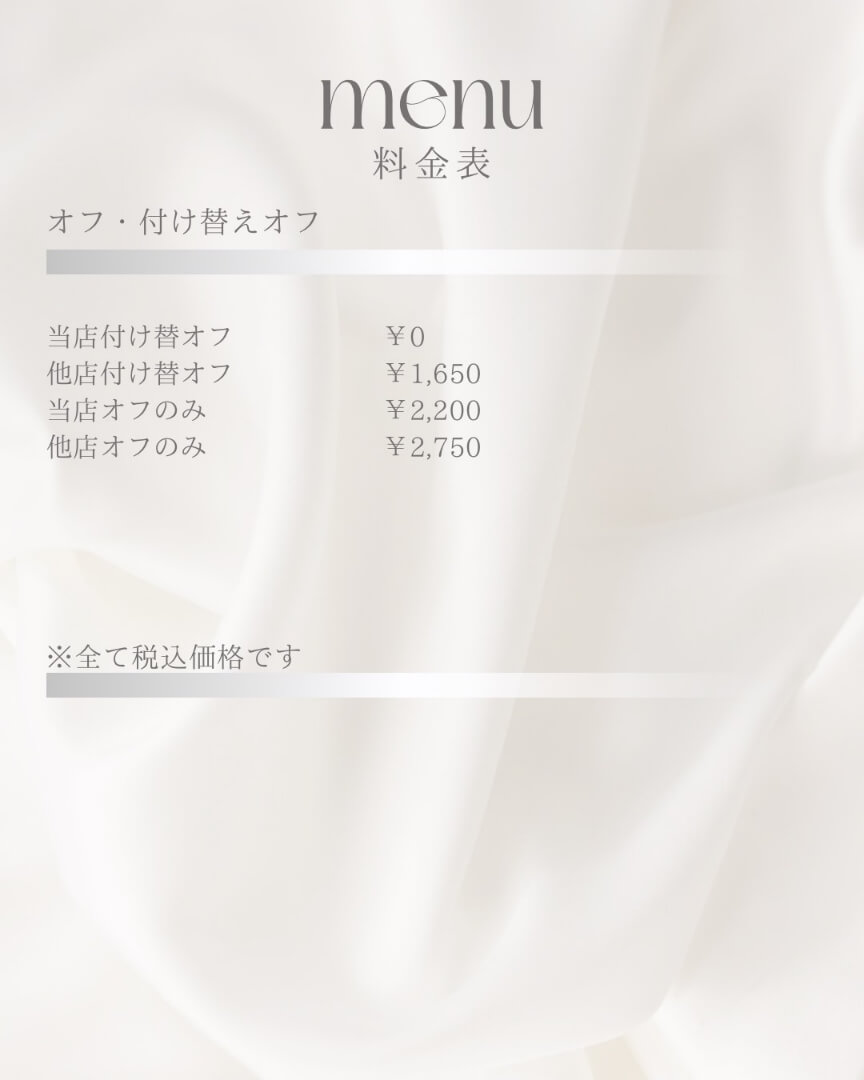 ・ご変更は前日18:30までにご連絡お願い致します。当日キャンセルはご予約時施術メニューの100%を頂戴致します。